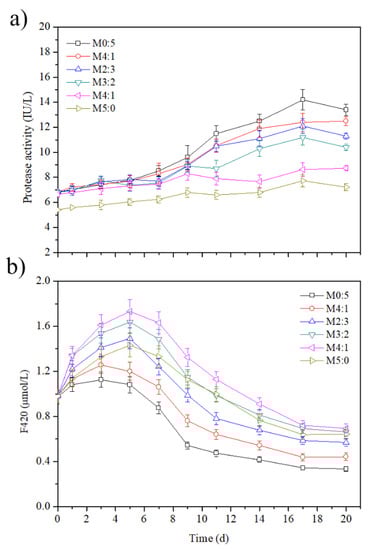 Figure 4 shows the effects of CEPS/FW ratios on the relative activities of protease and coenzyme F420. It is well known that protease activity is a characterization of protein hydrolysis, which plays critical roles in the hydrolysis of substrates. Clearly, the CEPS/FW ratios had a significant effect on protease activity, and protease activity decreased with an increase of CEPS/FW ratios. For example, average protease activities were up to 8.74, 10.4, 11.3, 12.5, and 13.4 IU/L in the M0:5, M1:4, M2:3, M3:2, and M4:1, respectively, and were 1.21, 1.44, 1.57, 1.73, and 1.86 times that of the M5:0 (7.22 IU/L). Meanwhile, the protease activity increased gradually in the first few days, then decreased slowly. For example, protease activity increased from 6.84 to 14.2 IU/L in M4:1 in the first 17 days, then dropped to 13.4 IU/L.