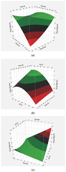 The evaporation rate (Equation (1)) at different microwave powers is plotted as a function of time (Figure 1a). The results showed that evaporation rate was not constant throughout the process; initially the evaporation rate increased rapidly until the 50% percent moisture contents of the juice were removed. Afterwards, its trend started to reduce and resulted in a parabolic curve. Effect of power, time and moisture content were studied by applying central composite design for optimization of evaporation rate (Figure 1a–c). The surface plot showed that the evaporation rate increased with the increase in microwave powers (Figure 1a). When power increased from 30 to 100 W, evaporation rate increased from 3.72 to 12.70 g/100 g.min. This increase in evaporation rate at 100 W was about four times higher than 30 W. it resulted in the reduction of overall processing time to fifteen minutes. The increase in evaporation rate was due to higher heating rate at 100 W compared to 30 W of microwave power. Thus, more vapors were produced, resulting in higher evaporation rate.