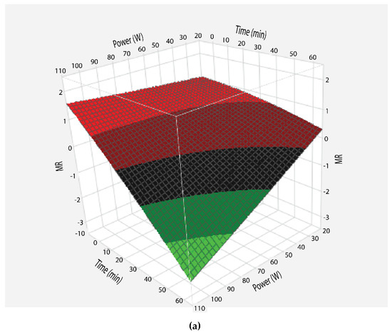 Moisture ratio at various powers was calculated by Equation (2) and results are shown in Figure 2. To visualize the combined effects of time and power on moisture ratio, the dehydration of sugarcane juice was studied by applying central composite design and the response surface graph was plotted (Figure 2a). For all microwave powers, the moisture ratio of samples decreased with the passage of time, but at variable rates. However, the moisture ratio curves varied significantly as a function of microwave powers. This may be attributed to the rapid heating at higher powers as discussed earlier. Thus, there was a rapid reduction in moisture ratio at high microwave power, which resulted in a steeper curve compared to evaporation at low power. However, experimental moisture ratios are compared with predicted moisture ratios, which indicates that both values are close to each other (Figure 2b).