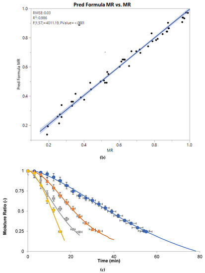 Moreover, nine thin-layer models were compared with experimental moisture ratio and the model with higher R2, and lower RMSE or χ2 values was considered as the best one. The drying kinetics of sugarcane juice was best described by Midilli model as supported by the statistical analysis; higher R2 (0.998) and lower RMSE (0.014) and χ2 (2.164 × 10−4) values for various microwave powers (Table 1). Furthermore, the Midilli model values were compared with experimental moisture ratio (Figure 2c) and were in good agreement.