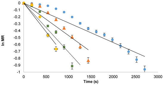 The values of moisture diffusivities (D) were calculated by plotting ln MR verses dehydration time (Figure 3). Slope of the straight line led to the calculation of D for all microwave powers (Table 2). The moisture diffusivities for microwave powers at 30, 50, 80, 100 W were in range between 0.684 and 6.62 (10−15 m2/s). The results indicated that values effective moisture diffusivities increased with the increase in microwave power. This increase in D can be attributed to higher microwave power that elevated the sample temperature, thereby increasing the water vaporization. Similarly, change in diffusivities are reported in literature [13]. Moreover, the activation energy and pre-exponential factor (Df) was calculated from Equation (14) [3] and their values were 1.981 × 10−3 W/kg and 4.32 × 10−9 m2/s, respectively.