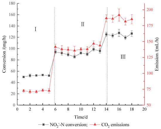 In Equation (1), NO2−-N and NO3−-N are the concentrations of effluent NO2−-N and NO3−-N, respectively, in units of mg/L. Among them, the amount of carbon sequestration is (influent IC–effluent IC–CO2 * density generated per unit time)/the amount of nitrogen entering the reactor per unit time. IC refers to inorganic carbon in various forms in water. The CO2 density was uniformly measured at 30 °C and 101 kPa and was found to be ~1.7738 g/L.