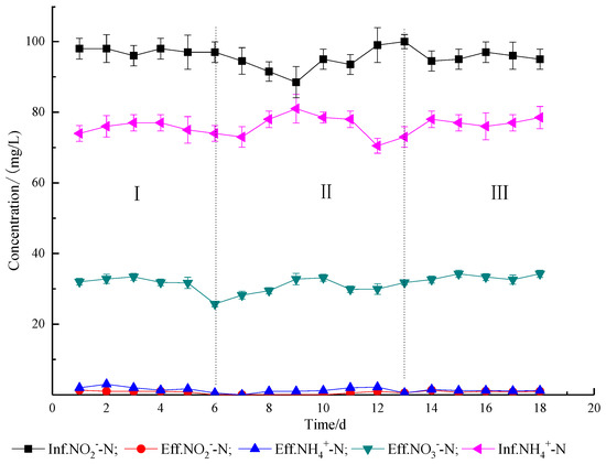 In the partial nitrification experiment, stages I, II, and III correspond to HRT of 14, 10, and 6 h, respectively. After the effluent water quality is stable, the nitrogen index is sampled and measured, and each sample is taken in three parallels. The nitrogen relationship between influent and effluent during the partial nitrification stage is shown in Figure 2. Under different HRT conditions, the effluent water quality is basically stable, the effluent NH4+-N concentration is 75–83 mg/L, and the effluent NO2−-N concentration is 90–104 mg/L. The second-stage effluent NH4+-N and NO2−-N have significant fluctuations compared with the other two stages because the HRT suddenly decreases, and so the amount of nitrogen passing through unit time is reduced and the system must re-establish equilibrium. In addition, the NO2−-N accumulation rate in the partial nitrification reaction is higher than 90%, and the NO3−-N concentration in each stage is less than 5 mg/L, indicating that the nitration reaction successfully stayed in the partial nitrification stage and the reactor was stable.