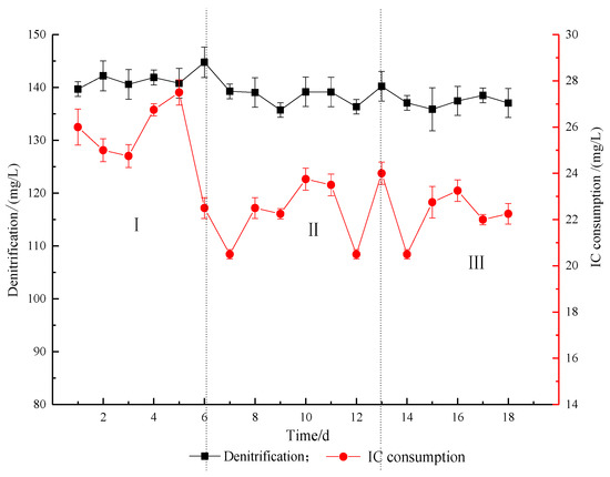 Anammox bacteria acts as autotrophic bacteria and uses IC as a carbon source for metabolism, according to the reaction formula proposed by Mulder et al. [28] (Equation (3)). It can be seen from the reaction formula that approximately 0.06 mol of IC per 1 mol of oxidized NH4+-N is newly metabolized into new cells by anammox bacteria. Studies at laboratory scale or under engineering scale have shown that the carbon sequestration capacity of anammox bacteria is related to microbial metabolism and to the process of biochemical reactions. Figure 6 shows the relationship between IC consumption and denitrification in the anammox stage of the HRT experiment. The IC consumption at different stages of the HRT experiment can be calculated to be 0.184, 0.161, and 0.161 mg/(mg·N). Therefore, the longer the HRT, the larger the consumption of the anammox reactor IC.