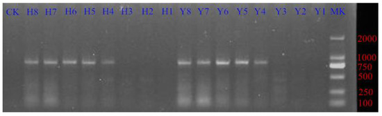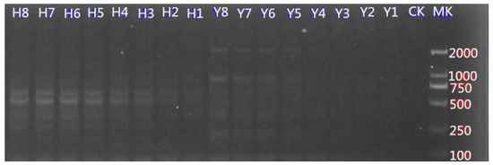 From Figure 9, there is no banding and towing phenomenon in the negative control CK lane. There are no bands in the Y1–Y4 and H1–H2 lanes, but there are no bands in the Y5–Y8 and H3–H8 lanes between 1260 and 1290 bp, and multiple nonspecific bands appear, indicating that PCR amplification failed. According to related studies, Schouten et al. used stable isotope fractionation to demonstrate that anammox bacteria use the acetyl-CoA pathway to immobilize CO2 to synthesize cellular material [29]. However, in this experiment, despite several attempts, the PCR effect is still not satisfactory; thus, the functional gene for reducing and immobilizing CO2 by the acetyl-CoA pathway has not been detected. There are many possible reasons for the unsuccessful PCR amplification, including incorrect operating conditions. The concentration of Taq DNA polymerase or Mg2+ may also be too high or low. The concentration of Mg2+ has a significant effect on the specificity and yield of PCR amplification. If the concentration is too high, the specificity of the reaction will decrease and nonspecific amplification will occur. If the concentration is too low, the activity of Taq DNA polymerase will decrease to reduce the reaction product. There may also be no coxL functional gene in this experimental sample; therefore, this pathway requires further study.