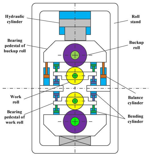 The external load of the HAGC system consists of several rollers, which present the symmetrical structure [43]. The basic load structure of the commonly used, four-high mill’s HAGC system is shown in Figure 1.