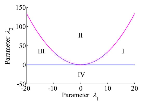According to the singularity theory [51], Equation (30) is the universal unfolding of the paradigm , and are the open fold parameters, and is the external disturbance quantity. If the values of the open fold parameters are different, the system will have different bifurcation patterns.