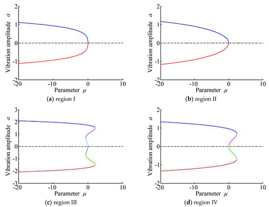 According to Figure 3 and Figure 4, the system plane is divided into four subregions (I, II, III, IV) by the transition set under the open fold parameters and . The bifurcation curves in each subregion have their own topological structure. Furthermore, with the change of and , the topological structure changes at the transition set. It indicates that the system has different vibration behaviors in diverse subregions and will exhibit different bifurcation behaviors under various parameter combinations. Therefore, by analyzing the bifurcation characteristics of the system, the parameter region that causes the system to be unstable can be determined. Meanwhile, from the obtained topological structures of the bifurcation curve in different subregions, the bifurcation state of the system can be changed by the disturbance parameter . In a certain bifurcation form, the change of will lead to the change of vibration amplitude, which in turn changes the vibration behavior of the system.