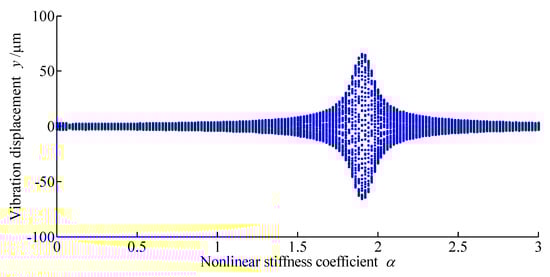 The influence of nonlinear elastic force can be reflected by the nonlinear stiffness coefficient . Hence, the effect of on bifurcation characteristics is firstly researched. According to Equation (11) derived in the previous section, the bifurcation diagram when changes is revealed in Figure 6. The jump phenomenon of the vibration amplitude will gradually be enhanced with the increase in . The degree of jump phenomenon is especially severe in the resonance region. However, when it is far away from the resonance region, the degree of jump will be reduced. The primary reason for the above result is that the change of the nonlinear stiffness coefficient affects the natural frequency of the system. As increases, the natural frequency of the system increases. The change of natural frequency results in the resonance phenomenon when natural frequency couples with external excitation frequency . However, the resonance phenomenon can cause the increase in system instability. Therefore, if is reasonably adjusted to effectively avoid the resonance region, the stability of the system will be facilitated.