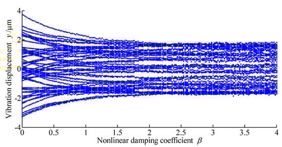 The effect of nonlinear damping force can be reflected by the nonlinear damping coefficient . Hence, the influence of on bifurcation characteristics was analyzed. The bifurcation diagram with the change of is illustrated in Figure 8. As can be observed, the jump phenomenon of the vibration amplitude will gradually decrease with the increase in , and the vibration amplitude is effectively suppressed. However, when the value of exceeds a certain threshold, the suppression effect for vibration amplitude is no longer obvious, and the jump phenomenon of vibration amplitude still exists. The main reason is that the appropriate can narrow the frequency band of resonance and decrease the unstable area, which is beneficial to the stability of the system.