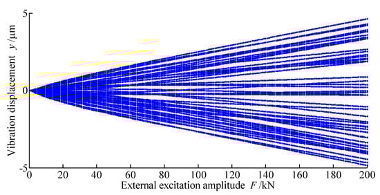 Since the influence of nonlinear excitation force can be reflected by the external excitation amplitude , the effect of on bifurcation characteristics was also investigated. The bifurcation diagram with the variation of is demonstrated in Figure 9. It will be observed that the jump phenomenon of vibration amplitude will gradually strengthen with the increase in . Furthermore, the degree of jump will gradually increase. The main reason is that the increase in can widen the frequency band of resonance and augment the instability of the system.