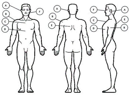 During the course of the experiments, participants’ heart rate, metabolic rate, average skin temperature, heat flux between the skin and the ambient air and core body temperature represented by the aural temperature are measured continuously. Heart rate monitoring is performed using a Polar H7 ECG (Polar, Kempele, Finland) strap that is placed under the chest, with a sampling frequency of 128 Hz. The metabolic rate, as metabolic equivalent tasks (METs) of each test subject, is calculated based on indirect calorimetry using a MetaMAX 3B (CORTEX-Medical, Leipzig, Germany) spiroergometer sensor. The average skin temperature is calculated based on measurements from three body-placed sensors, namely, scapula, chest and arm (Figure 2). The skin temperature measurements are performed using one Shimmer (Shimmer-Sensing, Dublin, Ireland) temperature sensor and two gSKIN® bodyTEMP patches (greenTEG, Zurich, Switzerland). Two heat flux gSKIN® patches are placed on both the chest and the left arm (Figure 2). The skin temperatures and heat flux measurements are acquired at a sampling frequency of 1 Hz. All the measured from the wearable sensors were received and saved on a smart phone. Core body temperature is estimated based on aural temperature measure measurements, which is performed using in-ear wireless (Bluetooth) temperature sensor (Cosinuss One, Düsseldorf, Germany) with a sampling rate if 1 Hz. At the end of each applied temperature level during the course of both experimental phases, a thermal sensation questionnaire, based on ASHRAE seven-point thermal scale, is performed for each test subject.