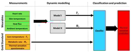 For the sake of present study, the measured variables are divided into wearables, which are easily measured variables using wearable sensors and gold standards (reference) variables, which are not suitable for wearable technologies. The wearables include heart rate , aural temperature , average skin temperature , skin heat flux and ambient air temperature . On the other hand, the gold standards consist of the core temperature , which is driven from the aural temperature [], metabolic rate and personal thermal sensation votes . The ultimate goal of this work is to develop an adaptive classification model to predict the individual thermal sensation depending, solely, on the wearables or estimated variables. Hence, both of the metabolic rate and core body temperature are estimated using an online dynamic modelling approach (Figure 3). Then, the individual thermal sensation is predicted using a classification model (classifier) whose inputs are the wearables and estimated the metabolic rate and core body temperature (Figure 3).