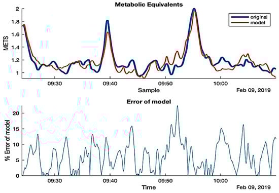 The results have shown that the developed general model (Table 3), for all test subjects, a higher average MAPE value (10 ± 2.2%) during the low activity phases than the average MAPE value (7.6 ± 2.6%) resulted during the high activity phases. The METs (metabolic equivalent tasks) are a measure which accounts for a normalized form of energy expenditure per kilogram of mass. There is a consensus that the measurement of the metabolic rate might vary among individuals (interpersonal) up to 75% [], even within the same day from morning to afternoon for the same subject (intrapersonal) up to 6%, though measurements on different days might be comparable on fasted subjects []. Hence, a general estimation model of individual metabolic rate will not be efficient in this case. However, the general estimation performance of the suggested general MISO model can be enhanced by using the online adaptive form of the SRIV algorithm []. The online adaptive (closed-loop) SRIV algorithm provides the possibility to personalise the developed general model by retuning the model parameters and model delays based on the streaming data acquired from the wearable sensors.