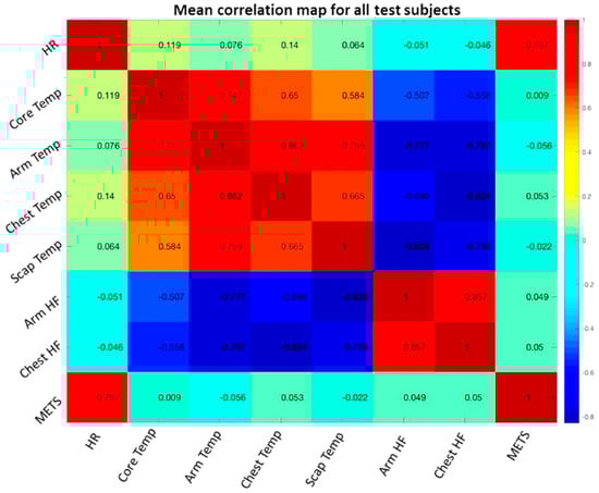 Colour-map of the correlation matrix representing the correlation levels () between the mean values of all measured variables, namely, heart rate (HR), aural (core) temperature, arm temperature, chest temperature, scapula temperature, heat flux from the arm skin (Arm HF), heat flux from the chest skin (Chest HF) and metabolic rate (METs).