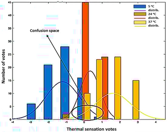 Distribution (distrib.) of the participants’ (25) thermal sensation votes at the three environment temperatures (24, 5 and 37 °C) showing the confusion space.