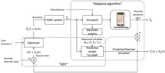 In this section, we introduced to an adaptive occupant-based HVAC predictive controller using the developed LS-SVM predictive classification model. The general framework of the proposed HVAC predictive controller approach is depicted in Figure 8. In this paper, we only describe the main methodology to use the LS-SVM predictive classification model for the occupant’s thermal state in the generalized predictive control (GPC) scheme, which will be studied and investigated further in future work. The GPC is one of the most popular model predictive controlling (MPC) methods in broad number of fields. The basic principle of GPC is to calculate a sequence (control horizon, ) of future control signals that minimizes a cost function defined over a prediction horizon () []. In general, the GPC algorithm consists of two main subsystems, namely, a prediction model and an optimizer. As shown in Figure 8, two main components, namely, the adaptive algorithm for LS-SVM predictive model and the GPC algorithm, are suggested.
