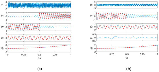 The improved EWT and traditional EWT decomposition results (red dotted lines represent the original signal; blue solid lines represent the decomposition results). (a) Improved EWT; (b) EWT.