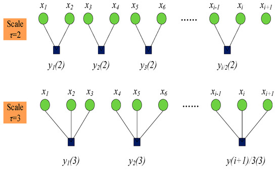 where represents the scale factor. When , the coarse-grain vector is the original sequence. For a given , the original sequence is divided into coarse granularity vectors of length , and Figure 4 shows the coarse granularity process for and .