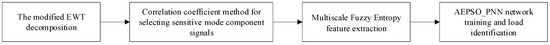 Thus, the overall flow of the ball mill load identification model that is proposed in this paper based on the modified EWT, MFE, and AEPSO_PNN classification methods can be summarized as shown in Figure 6.