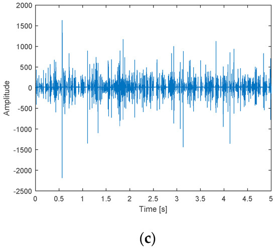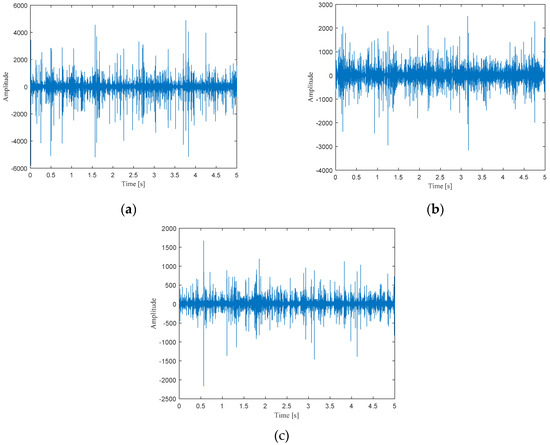 Waveforms of the original cylinder vibration signals: (a) working condition 1; (b) working condition 2; (c) working condition 3.