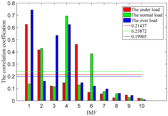 2. The correlation coefficients between the AM-FM components and the original cylinder vibration signal were calculated using Equation (29), and the threshold values were then calculated in accordance with Equation (30), yielding the following results: 0.21437 for working condition 1, 0.23872 for working condition 2, and 0.19905 for working condition 3. The correlation coefficient values and the threshold values of the vibration signals from the cylinder body under the three working conditions are shown in Figure 9.