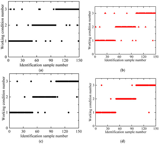Recognition results of test samples for each classifier. (a) BP neural network; (b) Bayes identification method; (c) PNN; (d) AEPSO_PNN.