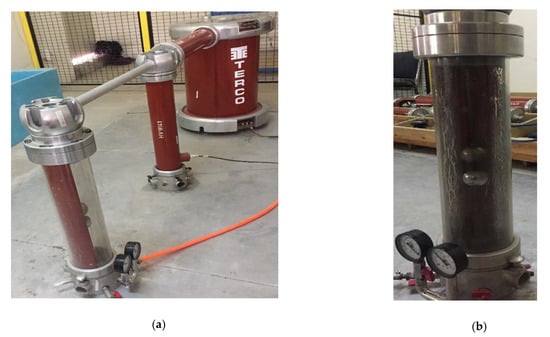Testing vessel for vacuum and gas is made of steel and equipped with a pressure gauge to measure pressure up to 6 bars. The manufacturing material of the electrode was aluminum enclosed with a nickel coating. The diameter of the electrodes is basically 50 mm. Electrode diameter was selected to be 50 mm because the gap length should be equal or less than the radius of electrode to maintain uniform electric field. In our experimental work the gap length is varied from 0–16 mm, therefore 50 mm is best appropriate diameter of electrodes. Figure 2a,b show experimental setup and testing vessel (HV-9134) respectively. The vessel contains a cylinder made of Plexi-glass that is sandwiched with flanges top and bottom which are linked with high voltage (HV) and ground potential correspondingly. The bottom cover is furnished with essential apparatus, such as inlet, outlet valve measuring gauge for vacuum and pressure. The specifications of the test vessel provided by the manufacturers are briefly described in Table 5.