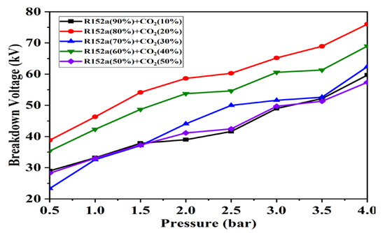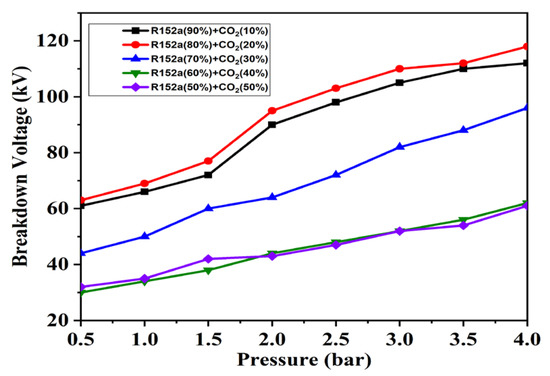 Figure 6 shows the breakdown voltage of R152a/CO2 under HVDC. HVDC in the range of 0–140 kV was generated by the Greincher voltage doubler circuit. The best breakdown strength in case of HVDC was achieved for R152a/CO2 (80%/20%).