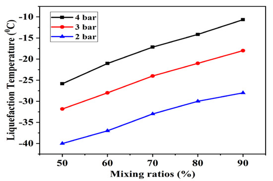 The formula for calculating the liquefaction temperature or saturated vapor pressure has been given in Equation (5) [31]. The boiling point (b.p) of R152a is greater than SF6 (−63 °C). Due to this reason, buffer gas CO2 is added to reduce the disadvantages of high boiling point because CO2 possess very low b.p. Increasing the CO2 content in the mixture of R152a/CO2 reduces overall b.p. Figure 9 shows mixed gas liquefaction temperature. It was proposed that by increasing the ratio of additive gas, the overall liquefaction temperature was reduced. The characteristic curve was achieved by assuming ideal additive gases.