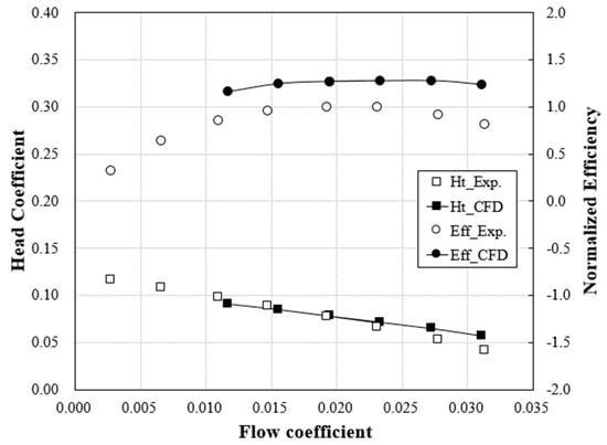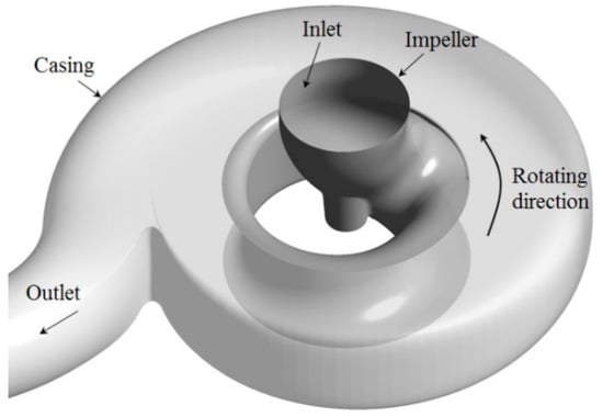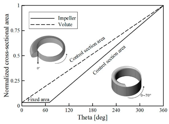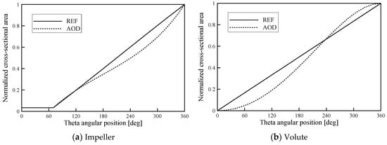 As shown in Figure 2, the cross-sectional area of the impeller of the reference model was designed considering the minimum thickness in the range 0–70° of the impeller. The impeller was designed to have the maximum cross-sectional area at the 360°. In the case of the volute, as shown in Figure 2, the cross-sectional area was designed to constantly increase from 0 to 360°. A more detailed description can be referred to in the authors’ previous work.