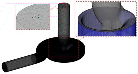 The grid system consists of a tetrahedral grid in the volute and impeller domains. In this study, y+ was kept below 2 to use the low Reynolds SST model, so that the flow near the wall was accurately analyzed. To eliminate the grid dependency of the numerical solutions, grid dependency test was performed at the design mass flow rate for the hydraulic performance of the pump. Based on the results in the previous work [23], the optimal grids system (a total of 2,500,000 nodes; 1,300,000 nodes in the impeller domain and 1,200,000 nodes in the volute domain) was selected, as shown in Figure 3.