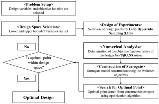 The flowchart for the multi-objective optimization process using surrogate modeling is shown in Figure 4. First, the objective functions and constraints are defined according to the design goal. Subsequently, the design variables considering constraints are chosen. The LHS [20] is used as DOE to select the design points and the objective functions are evaluated by (U)RANS analysis at these design points. The next step is the construction of surrogate model to approximate the objective functions and a searching algorithm, that is, hybrid PSO-GA, is used to combine and formulate these surrogate models. Finally, Pareto-optimal solutions—that is, a collection of non-dominated solutions—are derived and the multi-objective optimization procedure is terminated [26].