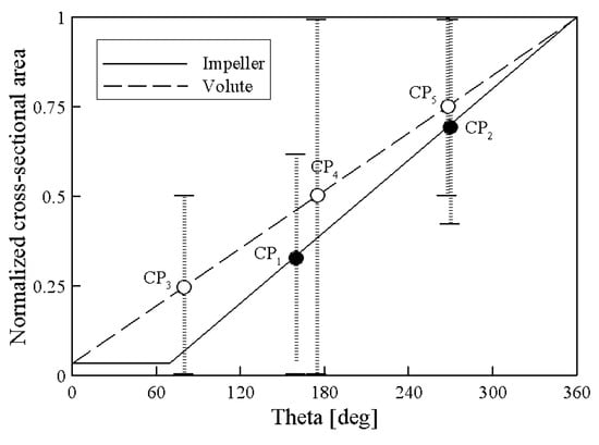 In this study, five geometric parameters associated to the internal flow characteristics of the pump were chosen as design variables to control the cross-sectional area of the volute and impeller. The distribution of the cross-sectional area of the internal flow of impeller and volute can be controlled smoothly by adjusting the control points represented by a third and fourth order Bezier-curve, respectively, as shown in Figure 5. Hence, the variations in the y-axes for two control points (CP1 and CP2) for the impeller and three control points (CP3, CP4 and CP5) for the volute were selected. Figure 5 shows the defined design variables and ranges are listed in Table 2.