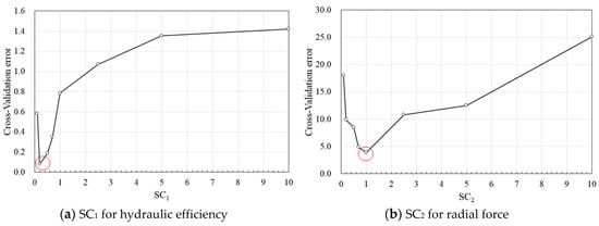 The network training was implemented by changing the SC values to identify the minimum cross-validation error. The parameters SC1 and SC2 are constants that are utilized to configure the surrogate model with respect to the efficiency and radial force, respectively. The SC values were chosen using a k-fold cross-validation test [28], which is a validation method that estimates how the results of statistical analysis are generalized to independent datasets. The process of the k-fold cross-validation test used in the present work is described as follows: