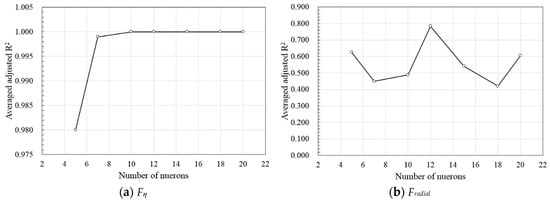 As shown in Figure 7, the error was minimized when the values of SC1 and SC2 were 0.2 and 1.0, respectively. Neural networks with various numbers of neurons were trained 10 times and the averaged adjusted R2 values are compared (Figure 8). The same quantity of neurons was used in each layer; when using 12 neurons, the statistically most accurate models with adjusted R2 equals to 1.00 and 0.78 could be achieved.