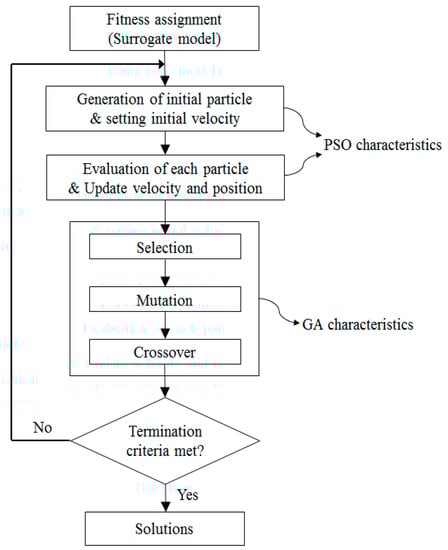 Once the surrogate model is constructed, it is necessary to find the optimal point on the fitness assignment, which is the output in the form of a function of the surrogate model. In the present work, a hybrid PSO-GA algorithm that was most recently developed [18] was used as searching algorithm to identify a global optimal solution within the fitness assignment. It is known to have a high reliability. Hybrid strategies combine two or more algorithms to maximize the benefits of each algorithm. One benefit of the PSO algorithm is its simplicity and another one is that the PSO algorithm controls the convergence criteria to identify the optimal solution in a short time. The GA, on the other hand, has the advantage of finding the global optimal solution by controlling the genetic search operators—that is, the crossover and mutation rates—which affect the convergence. The locations of the global best particles are updated by the genetic search operators to prevent premature convergence. By using the genetic search operators, the locations of the particles can be exchanged among the particles and thus have the ability to escape the local optima.