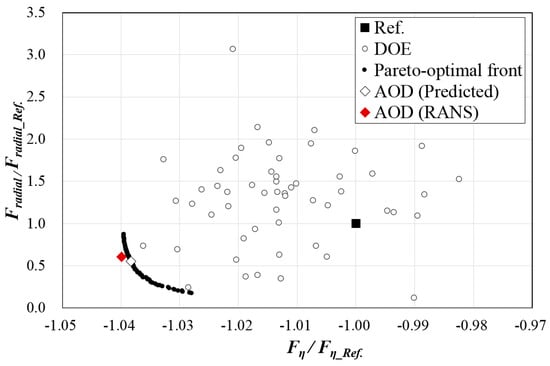 The arbitrary optimum design (AOD) was obtained as the final design near the center of the Pareto-optimal front, to improve the prediction of both the objective functions compared to the reference. The values of the design variables and objective functions of the AOD, along with those for the reference design, are listed in Table 3. The AOD showed an improvement of 3.07% and 44.80% for the hydraulic efficiency and radial force, respectively, compared with the reference design. In contrast, the relative errors between (U)RANS and the predicted values for these objective functions were 0.16% and 8.77%, respectively.