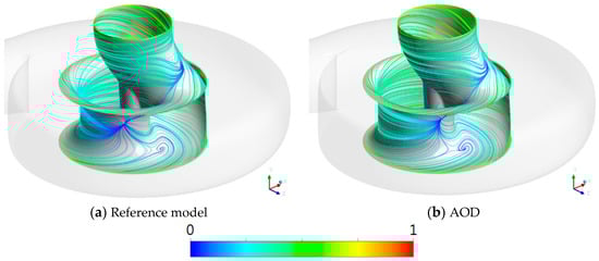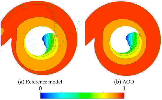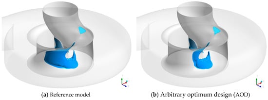Figure 12 shows time-averaged iso-surfaced contours having a low velocity component (1.5 m/s), which is the flow separation zone, for the reference model and AOD. For the reference impeller, the large flow separation zone formed along with the internal annulus wall in the single-channel impeller, as shown in Figure 12a. On the contrary, the flow separation zone was reduced remarkably in the downstream region of the optimized impeller, as shown in Figure 12b.