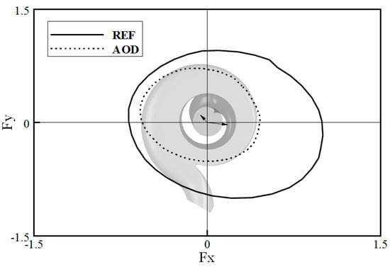 The sweep area distributions generated by the unsteady radial force components during the impeller one rotation for the reference model and AOD are plotted in Figure 15; they are averaged at the cylindrical surface near exit of the single-channel impeller. Here, all Fx and Fy values of the radial force were normalized based on the maximum radial force of the reference design. As shown in Figure 15, the sweep area distribution in the reference design leaned a little toward the fourth quadrant, whereas it was closer to the origin for AOD. Moreover, the sweep area in AOD reduced significantly compared with the reference model. As discussed previously in Section 3.4, the radial force in AOD decreased by 14.73, compared with the reference design.
