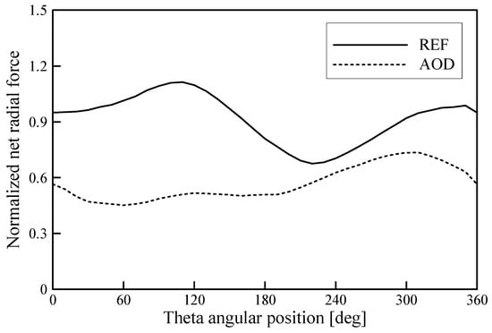 Figure 16 shows the unsteady fluctuation distributions in the net radial forces during the impeller one rotation in the reference model and AOD. Here, the net radial force values were normalized using the maximum net radial force value of the reference design. The fluctuation amplitude in AOD generally decreased during one revolution of the impeller, especially for flat formed angles from 0 to 240°. In addition, the net radial force distribution in AOD was lower and mostly flat compared with the normalized values of the reference model. The remarkable reduction in the radial force sources can be explained clearly by the optimization of this work.