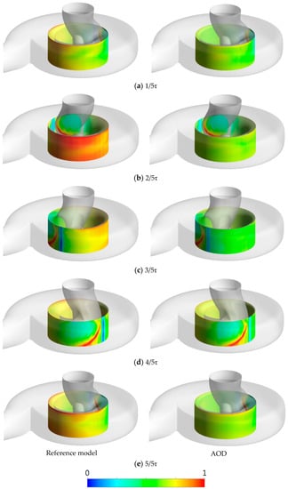 The instantaneous change in the unsteady pressure values on the cylindrical surface near the exit of the impeller for the reference model and AOD are shown in Figure 17. Here, the impeller one rotation is divided into five steps to clearly explain the variation in the flow phenomenon with time during impeller one rotation. In the reference model, the pressure variation caused by the impeller–volute interaction is prominent and then increases gradually, especially in Figure 17b. As discussed previously in Figure 15, the high-pressure zone is the fourth quadrant where the sweep area distribution leans slightly. Owing to this repetitive rotation, fluid-induced vibration caused by unsteady radial forces are observed. These unbalancing phenomena have an adverse effect on pump performance. In contrast, unsteady pressure distribution is generally uniform during the impeller one rotation; especially, at the same time of the reference model. With these trends, the high-pressure variation induced by the impeller–volute interaction clearly disappeared in Figure 17. Therefore, the AOD resulted in mostly stable flows in the pump with high efficiency and low radial forces. There is a remarkable decrement in the fluid-induced vibration induced by the impeller–volute interaction from the current multiple optimization result.