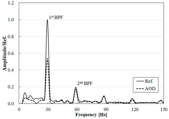 Figure 18 shows the spectra of the normalized amplitude values based on the wall pressure fluctuations measured at the observation point on the casing wall near the tongue of the volute located in the fourth quadrant in Figure 15. In Figure 18, the first blade passing frequency (BPF) is measured at approximate 30 Hz, and this is represented by the fluid-induced vibration characteristics from the impeller–volute interaction. These peak amplitude values are clarified at every harmonic BPF in 30 Hz steps due to the periodic motion of impeller rotation. In the AOD, a remarkable decrement in the amplitude values at the first BPF was occurred, and the decrement in fluid-induced vibration induced by the impeller–volute interaction was confirmed.