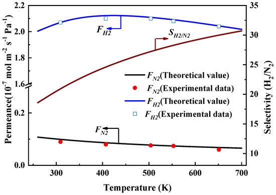 Figure 7 the nitrogen permeance decay upon the temperature increased in the range between 260 and 700 K. This trend can be ascribed to its Knudsen diffusion mechanism via which the permeance decreased with temperature as illustrated by Equation (7). Compared with nitrogen, the hydrogen permeance displays a different trend and reaches its maximum value of 2.12 × 10