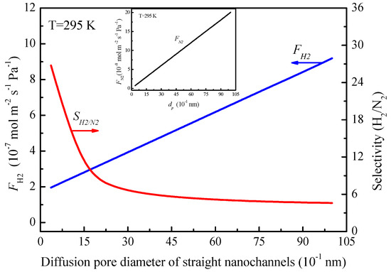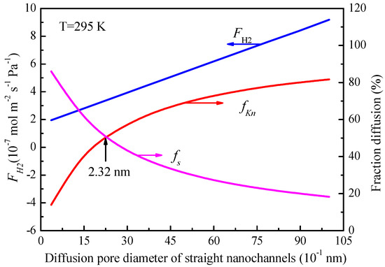 The change of the gas permeance and the transport fractions of Knudsen diffusion and molecular sieving with the pore diameter of the straight nanochannels can be calculated from Equations (7) and (12). According to the relationship between the gas permeance and the average pore diameter of straight nanochannels at 295 K as shown in