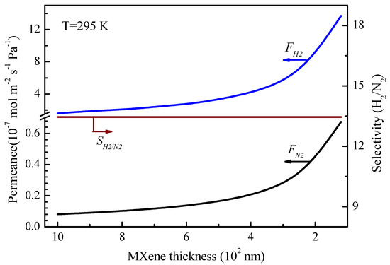 2 selectivity maintains at 13.5. It indicates that the thinner MXene layer can lead to higher gas permeance for hydrogen or nitrogen (Equations (7) and (12)) but maintain the gas selectivity unaltered.