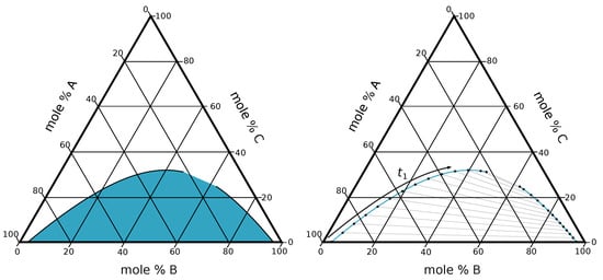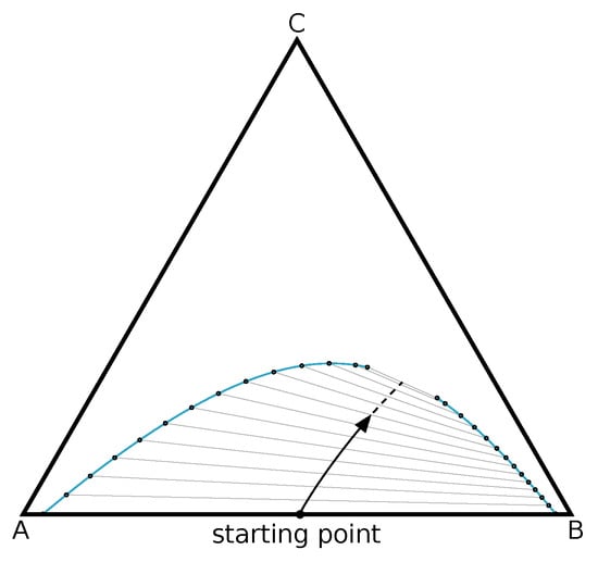 In an effort to track solutions along the binodal curve, the feed composition is varied along a line with a constant phase ratio. This trajectory, depicted in Figure 2, starts from a point on the border of the phase diagram and covers the entire miscibility gap of a ternary mixture. For all feed compositions along the trajectory, corresponding points on the binodal curve are obtained by solving the equilibrium model using Equations (16) and (17). In comparison to the previous approaches in [4,10], this strategy only requires sampling on a line in the miscibility gap instead of sampling in the whole area. If the starting point does not lie on the border of the phase diagram, the line has to be tracked in both directions from the starting point.