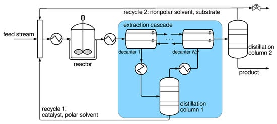 A multistage liquid–liquid extraction process adapted from [10] is used here as a case study for the methods presented above. In [10], the optimization of a process for the homogeneously catalyzed hydroformylation of 1-dodecene in a thermomorphic multiphase system is considered. The mixture is homogeneous at reaction conditions and biphasic at lower temperatures. This is used to separate the catalyst from the product in an extraction cascade and to recycle the catalyst back to the reactor. The extraction cascade considered here is highlighted in Figure 3, which shows a modified flowsheet of the overall process from [10].