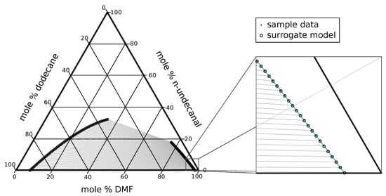 Results of sample data generation and surrogate fitting. The binodal curve is shown for , i.e., for a mixture without 1-dodecene. The surrogate used for this figure has neurons in the hidden layer of the artificial neural network (ANN) (see Table 3).