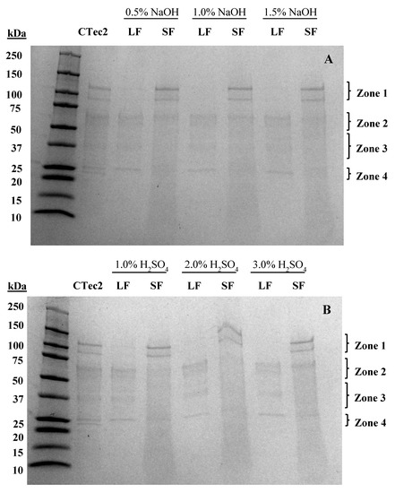 Cellulases related to Cel7A, Cel6A, and Cel7B in Zone 2 showed some binding tendencies based on the bands from the SF both pretreatment methods. Due to the appearance of unclear regions, enzyme binding on lignin isolates in Zone 3 could not be determined. However, based on the presence of bands from LF in Zone 3, it might be inferred that enzymes related to zone 3 were still suspended, at least partially. In Zone 4, two distinct bands potentially related to some EG and XYN were observed with the CTec2 control. However, only one upper band was detected from the LF (Figure 1A,B) suggesting partial loss due to binding on SF. Overall, the tendency of CTec2 binding onto lignin isolates was similar for NaOH- and H2SO4-derived isolates.